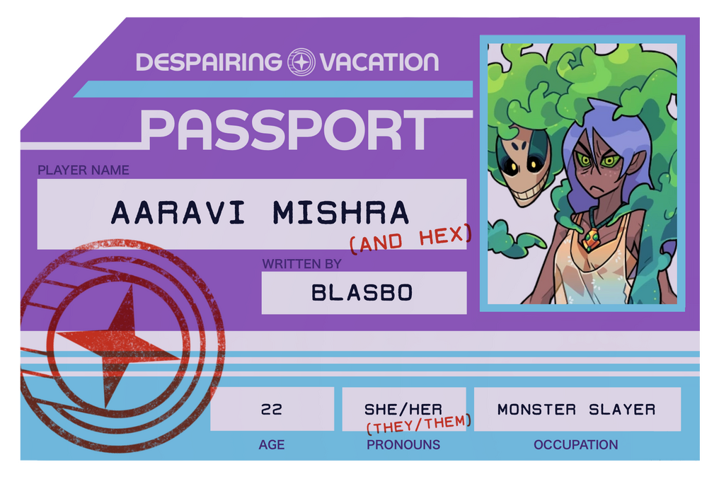 STATUS: ALIVEAaravi Mishra is short-tempered, a little mean, a lot abrasive and a worrying amount of hyper-competitive, the kind of girl who thinks of everything in life as a competition that she intends to win. Peggle? She's going to win. Sniffing the flowers? She's going to huff SO MUCH POLLEN. Looking at the moon? She's going to out-stare the FUCK out of the moon. Her anger management issues and general troubles with being social mean that she's hard to get around with--and that's before she starts casually mentioning killing or trying to kill members of the Despair movement as if it's not a big-ass crime. Her history is fairly obscure, as a lot of it has happened to be off the official books, but if you ask people about 'The Slayer' they will tell you she has definitely killed people before.If you saw Aaravi's name in the sign-ups for a local DBFZ tournament, no you didn't. Unless she won in which case fuck yes you did, you better look at how hard she CRUSHED IT.She's also got a sentient curse attached to her through a cursed necklace. Their name is Hex and they like bagels.