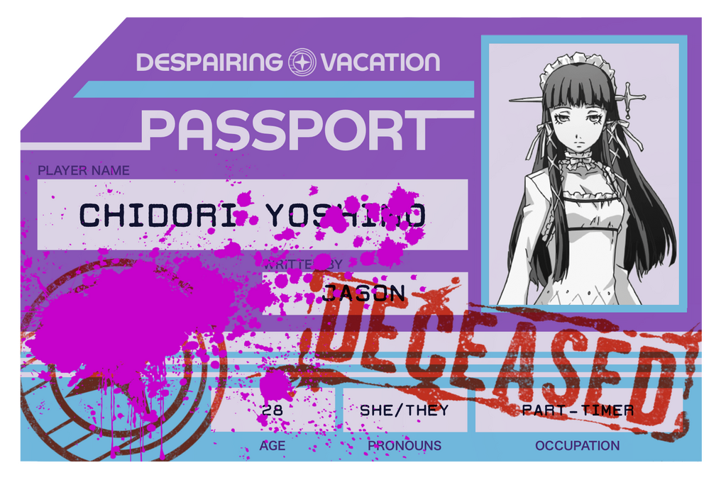 CW FOR GORE AND DISMEMBERMENT.Chidori Yoshino was one third of the troublemakers known as Strega during the Tatsumi Port Island Incident. Records of her and Strega are spotty, but she seems to have been aligned with Despair before its worldwide outbreak. She completely disappeared during the Tatsumi Port Island Incident, and has only recently returned to the public. Where did she go, and why has she returned?